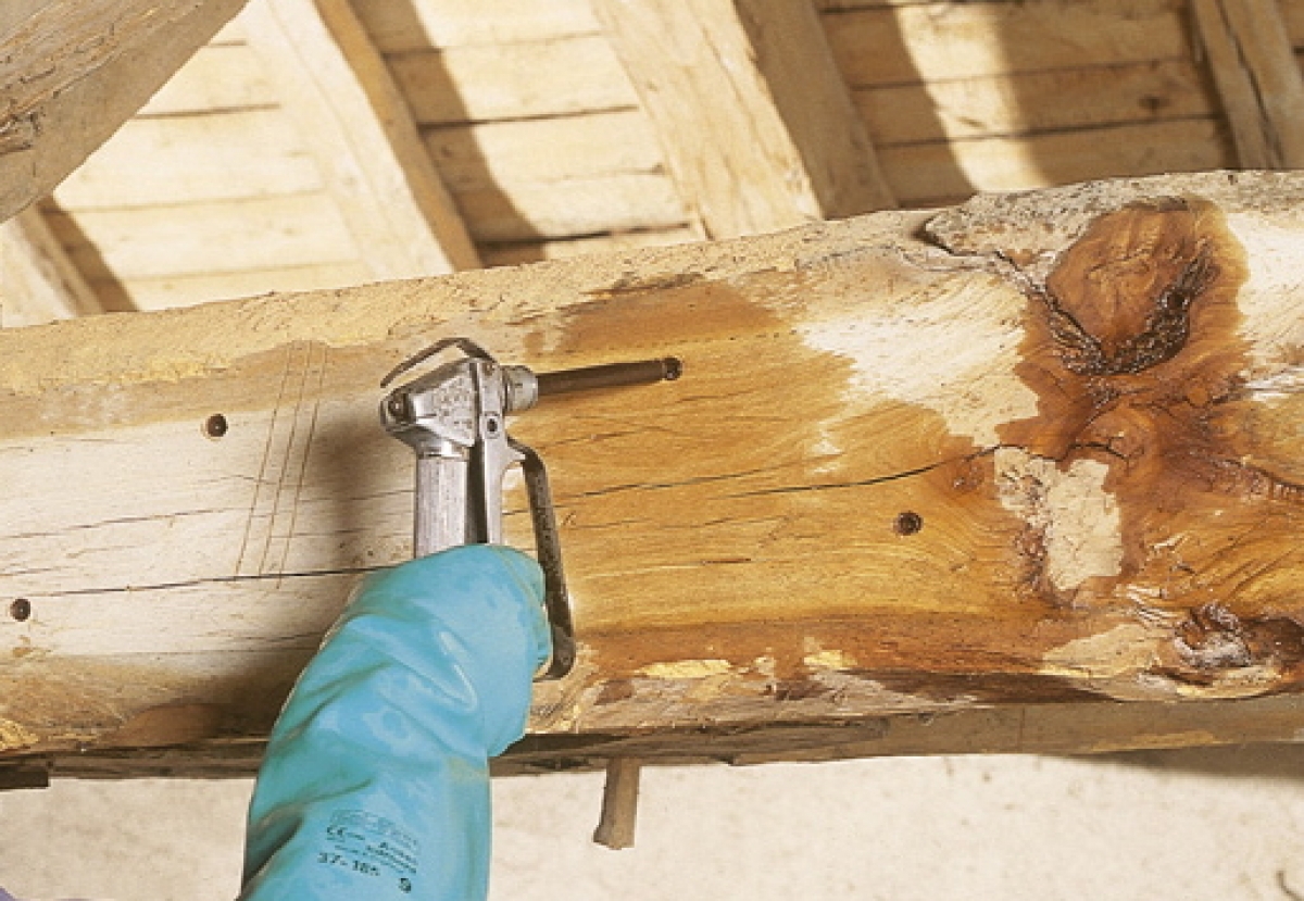 Le décapage et le bûchage des parties contaminées. Cette opération a pour but d’éliminer l’ensemble du bois vermoulu en surface des différentes pièces de bois (grosses pièces, chevrons, etc …) et de mettre à nu le bois encore sain. Il ne faut pas négliger cette phase car l’absence de bûchage gênerait la pénétration des produits appliqués.
